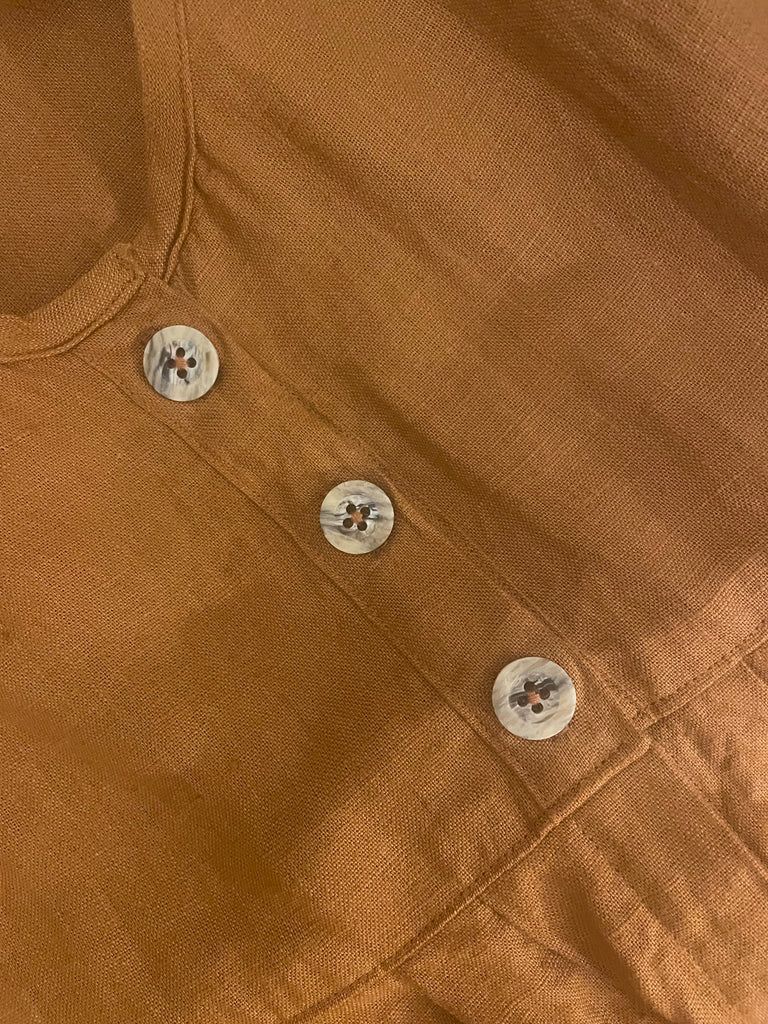 Cinnamon linen women’s button front long sleeved dress jacket. Measures 44” at bust and 40” long. Three buttons, just on bodice. Pleats to front and back of skirt. Front pocket.