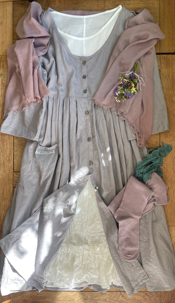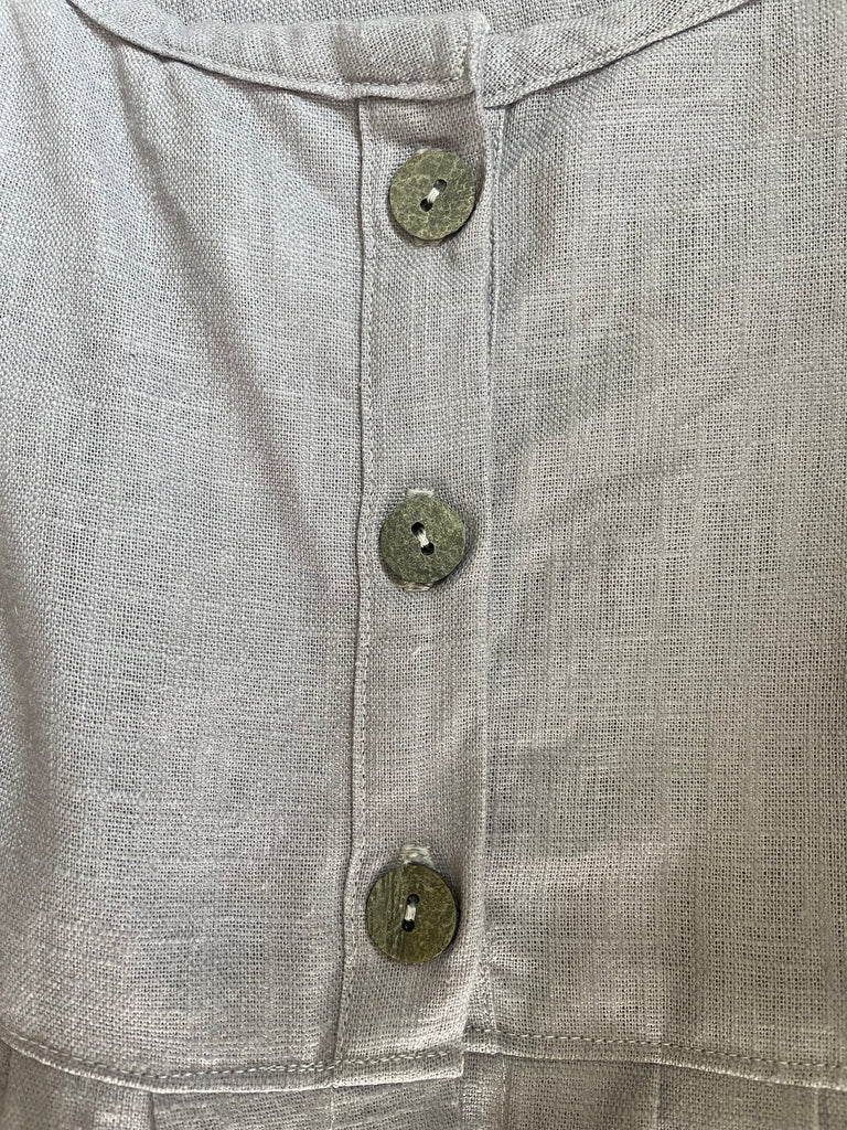 Dove grey linen women’s long button front dress jacket. Measures 42” at bust and 47” long. Stone buttons down fully opening front. Pleats to front and back of skirt. Long sleeves. Front pocket.