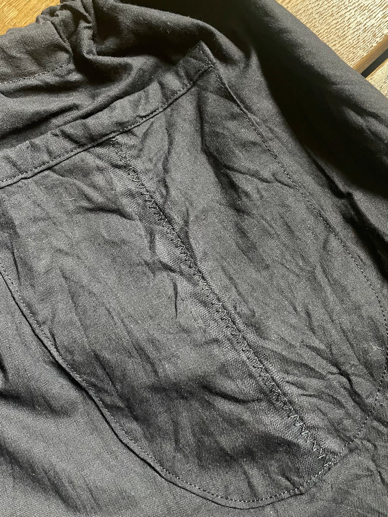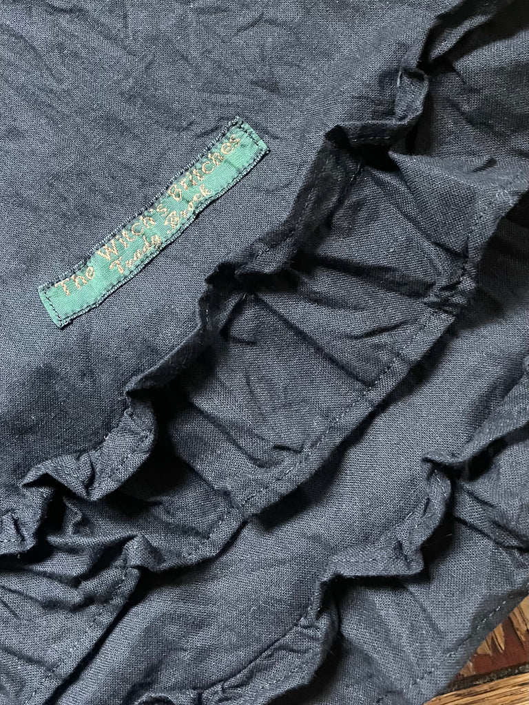 Black cotton women’s Victorian style bloomers. Measure 36” at hip and 28” long. Elasticated drawstring waistband for flexible sizing. Double ruffle frill and back pocket.